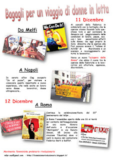 Dal centro storico all'Inps a altri posti di lavoro, ad alcune grandi scuole superiori occupate in questi giorni, dove le studentesse si sono interessate alla locandina e ne hanno prese alcune copie per attaccarle all'interno, con uno spirito vivace e determinato, precarie e lavoratrici hanno diffuso la locandina appunto della marcia che pone la necessità di costruire un nuovo sciopero delle donne che, come è stato lanciato dal bello e partecipato seminario di Palermo, "... deve avere come aspetto centrale proprio la condizione delle lavoratrici, del lavoro e non lavoro, la condizione di discriminazione, di attacco ai diritti conquistati..." In questo paese infatti va maturando una situazione in cui emerge chiaramente l'aggravarsi della condizione di lavoro e di vita della maggioranza delle donne con alcuni punti centrali: dalle operaie della Fiat di Melfi, sottoposte doppiamente al fascismo padronale, alle braccianti moderne schiave nei campi, alle immigrate sempre più oppresse e sfruttate per cui subire questa condizione è insito nel sistema capitalistico ma oggi ciò si carica di nuove contraddizioni..." e vi sono anche poi gli altri settori delle lavoratrici precarie sempre più precarizzate, vedi quelle delle pulizie o delle Coop Sociali, le donne disoccupate sempre più in aumento nel nostro paese...