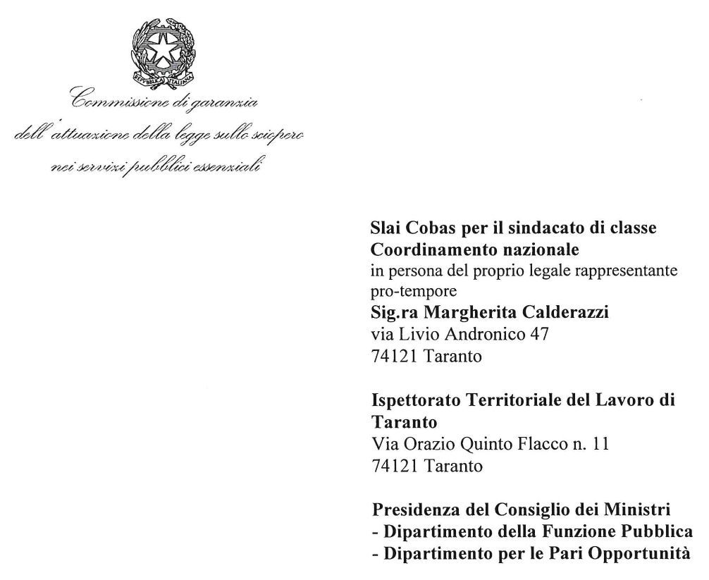Commissione Garanzia Sciopero con la nota che in parte riproduciamo ha