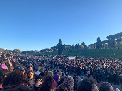 … La manifestazione di Roma è stata grandissima, enorme, mentre parliamo facciamo scorrere delle foto e dei video per dare l’idea concreta innanzitutto dei numeri, era una fiumana di manifestanti, in prima linea tantissime donne di tutte le età, tantissime le giovani e giovanissime, una presenza che non finiva mai, al concentramento il grande piazzale del Circo Massimo era pienissimo, i numeri comunicati dal movimento di Nudm, promotore della manifestazione, di cinquecentomila corrispondono alla realtà e quando il corteo si è messo in moto lentamente vista la grande massa le persone, le donne, i giovani… erano dappertutto, lungo i lati, sui ponti… insomma non c’era un metro quadrato delle strade vuoto… in effetti questa manifestazione è andata oltre le stesse donne, le diverse soggettività organizzate con Nudm, gli stessi altri collettivi che ci potevano essere in piazza; l’anno scorso quando siamo andate a Roma il 25 novembre eravamo circa 100-150.000 ma quest’anno i numeri si sono più che triplicati ed è stato innanzitutto molto bello ed emozionante vedere e toccare con mano questa folla oceanica unita dalla stessa volontà di manifestare contro la violenza sulle donne, i femminicidi e non solo.
